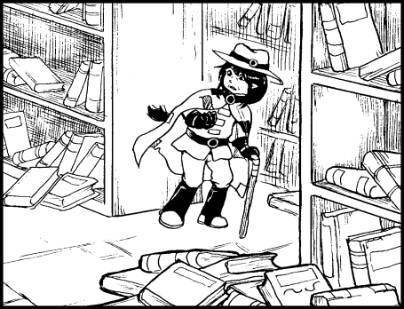 Inric peers around the shelves, across piles of books heaped haphazardly over the floor. Nothing jumps out as he moves cautiously down one aisle, but a dark shape is watching him...
