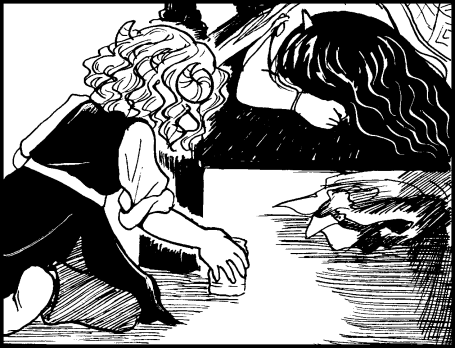To her relief, the pump works. Mina refills Inric's cup, then soaks a rag in water and tries to put it to his forehead. The way he's lying doesn't help. Water drips down his arm and puddles on the wood he's lying on. Mina can tell her makeshift poultice isn't going to do much. If only she had some real medicine...