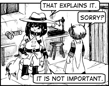 "That explains it," the stranger says, looking down at the odd little creature that followed him in. Mathea can't make head nor tail of his comment.