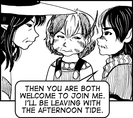 "Then you are both welcome to join me," the man interrupts. "I'll be leaving with the afternoon tide."