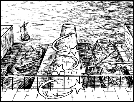 Crouched uncomfortably in the bow of the Raven Cloud in an attempt to be inconspicuous, Arvid almost misses the beginning of the chaos. He is nudged out of a semi-doze in time to see the mast of the neighbouring ship fall, descending silently and almost elegantly with trailing ropes until it slams into the deck, and the shouts and cries of the crew rise up around them. Not just one crew either. All around the harbour the warships are breaking and dying, planks springing apart, ropes snapping, spars falling, boats sinking. Their crews struggle to disembark, many of them having to splash their way to the docks where their luckier, drier fellows help haul them out. Amid all the chaos, nobody notices that the small merchant ship that had been coopted into the war effort remains unharmed, and nobody notices when that ship pushes out to sea, and by the time the sails are raised, it is too late. Similarly, the slight shimmer of the air over the walkway goes entirely unremarked.