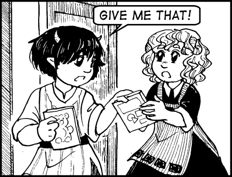 "This was your idea!" He scowls, then grabs her book. "Give me that!" And he marches into the room, giving Mina very little choice about following him.