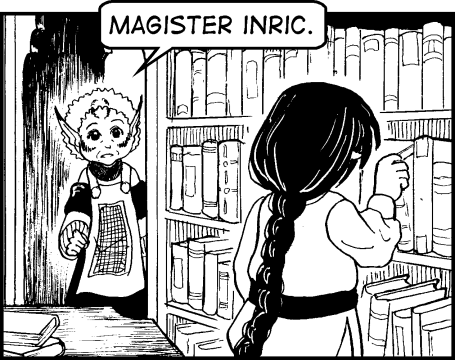 Inric is picking through a bookshelf and choosing volumes for Mina and Jakin when Magistra Colle arrives.
