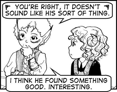 "You're right," Colle muses, lapsing into Eynvardis, "it doesn't sound like his sort of thing." Then, to Mina, in careful Eldarin, "I think he found something good. Interesting. Don't worry." Mina looks dubious. "I mean," Colle continues, speaking more to herself now, in Eynvardis, "he's old enough to look after himself."