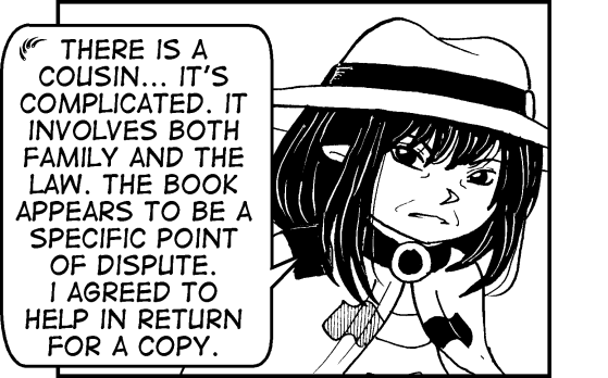 "Ellis was not the one causing the problem. There is a cousin... it's complicated. It involves both family and the law. The book appears to be a specific point of dispute. I agreed to help in return for a copy."