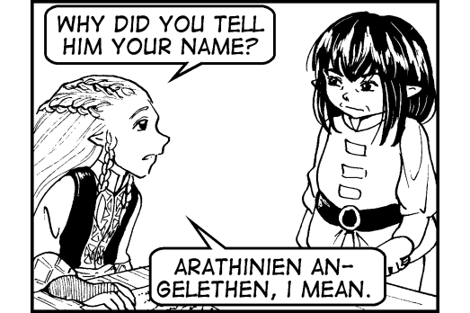 "Why did you tell him your name?" Anvar asks. "Arathinien An-Gelethen, I mean."