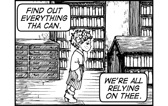 It is morning, and despite the half-remembered warmth of the bookwyrm kit in the night, Tiero feels cold and lonely as he leaves the room he was given. He wanders through the library, remembering what Prytanis said, feeling daunted. "Tell me about it. And everything else about his home. Find out everything tha can. We're all relying on thee."