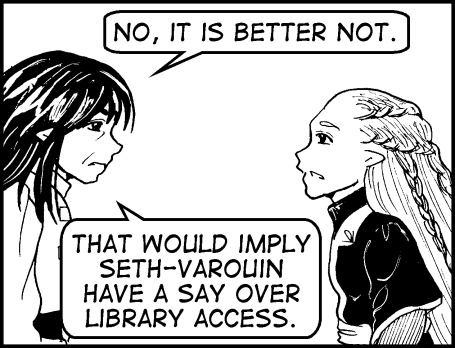 Inric rouses himself from his reverie. "No, it is better not. That would imply Seth-Varouin have a say over Library access." He turns to the door. "The Library is open to all. Visits used to be common."