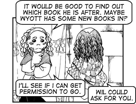 "But he will come back," Aldus says, confident of that much at least. "He's looking for a book in Milburh, and I doubt he found it during our, ah, little investigation." He frowns in thought. "It would be good to find out which book he is after. Maybe Wyott has some new books in? I'll see if I can get permission to go."