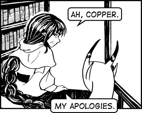 "Ah, Copper." Inric, seated on his bed, looks behind him as the bookwyrm approaches. "My apologies." He sighs, loosening the clasp on his cape. "We will have to go back for the book." He raises a hand to pet the questing head, then stares at the bookshelves as Copper curls up next to him. "I thought it would be the same as the ships. I was wrong."