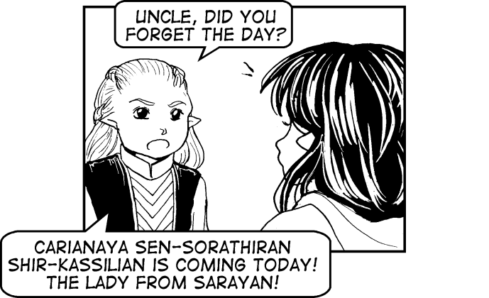 "Uncle, did you forget the day?" Anvar demands, dismissing Aldus. "Carianaya Sen-Sorathiran Shir-Kassilian is coming today! The lady from Sarayan!"