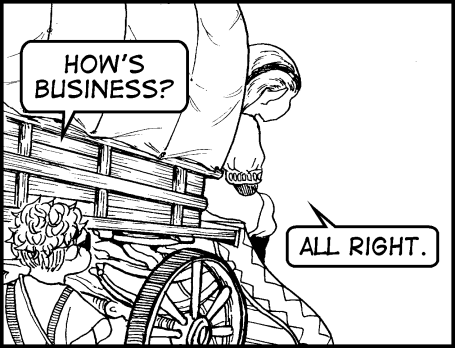 "All right." The figure seated at the other end of the wagon doesn't look round. Kelyn comes closer to see him better. Jory is looking away. "You got the usual?"