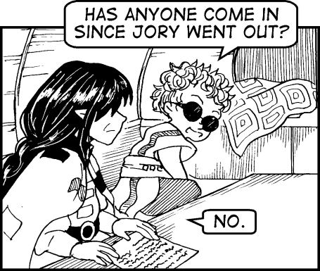 "Has anyone come in since Jory went out?"